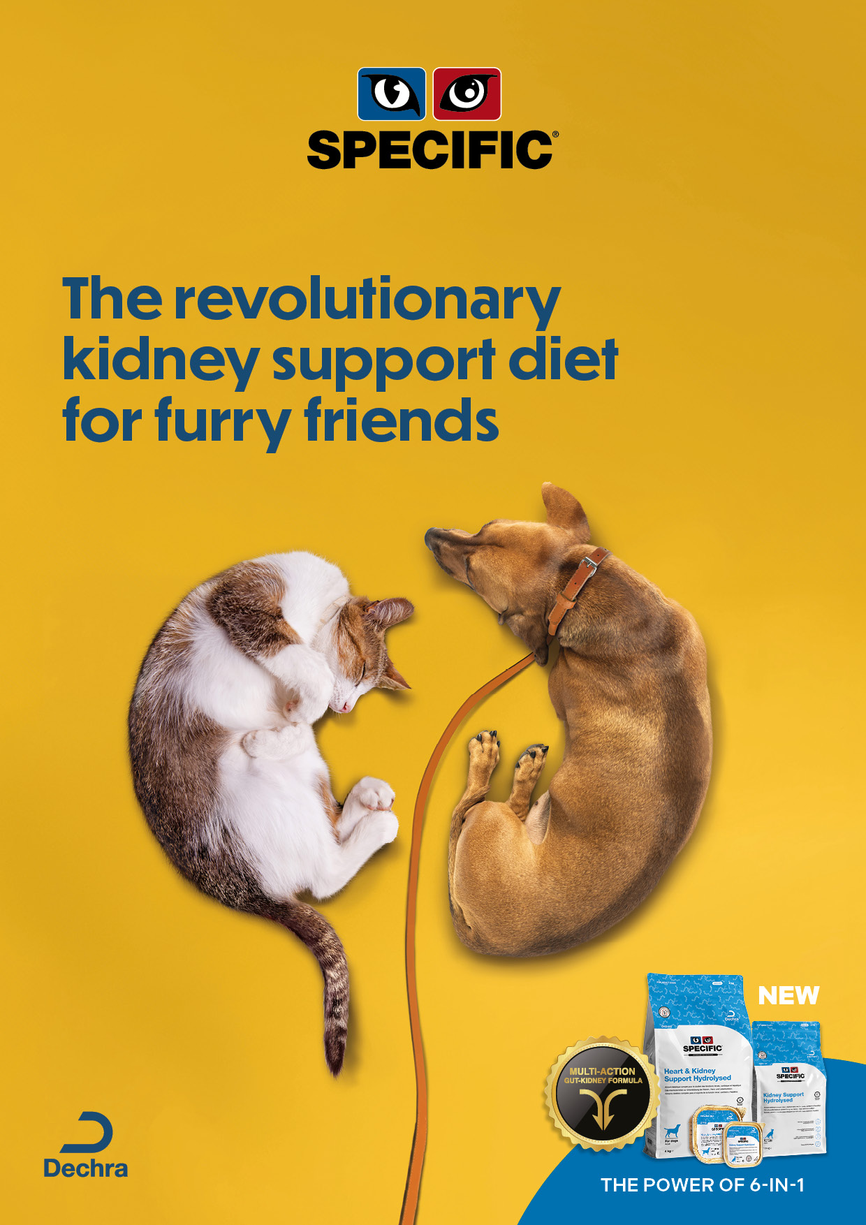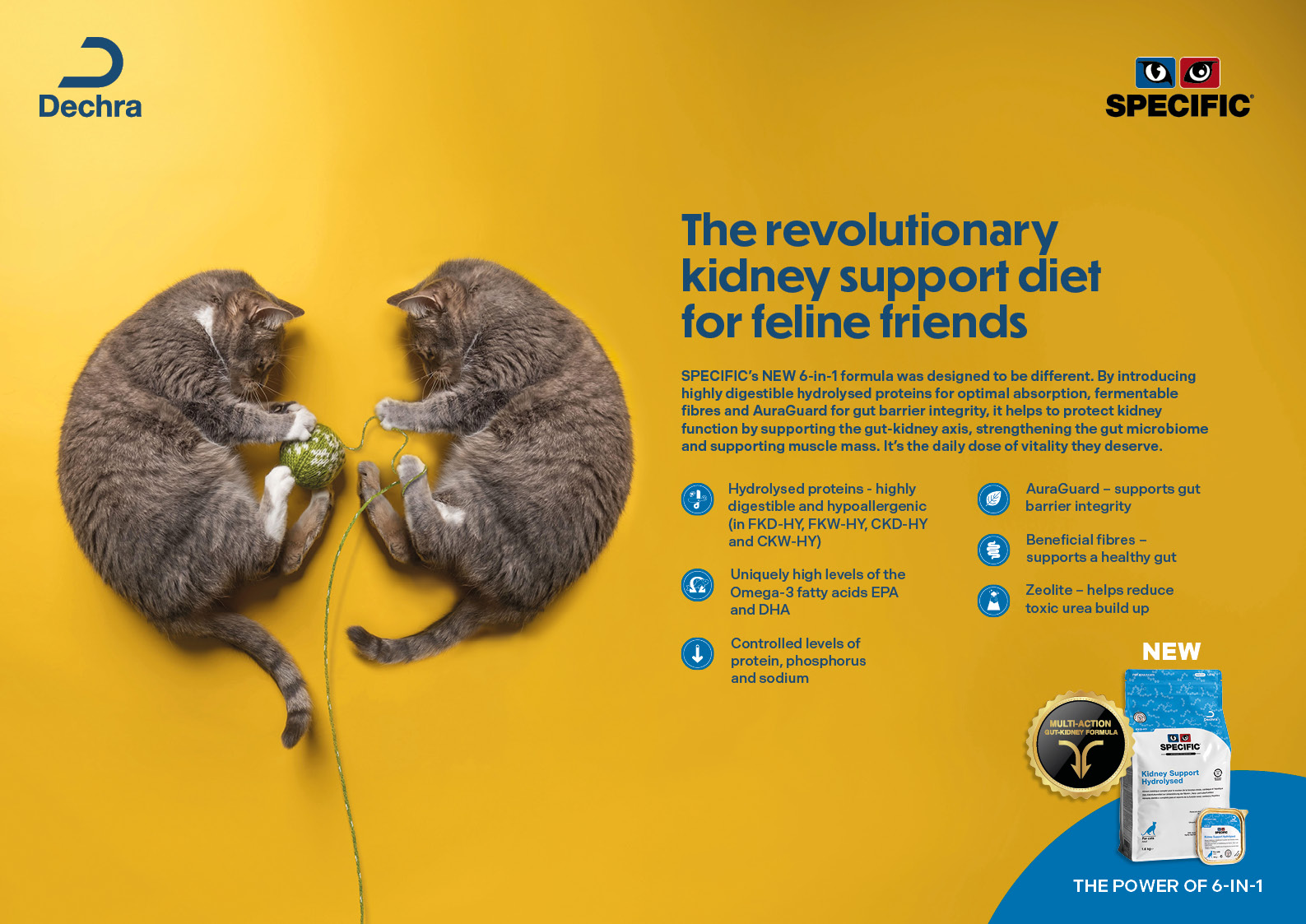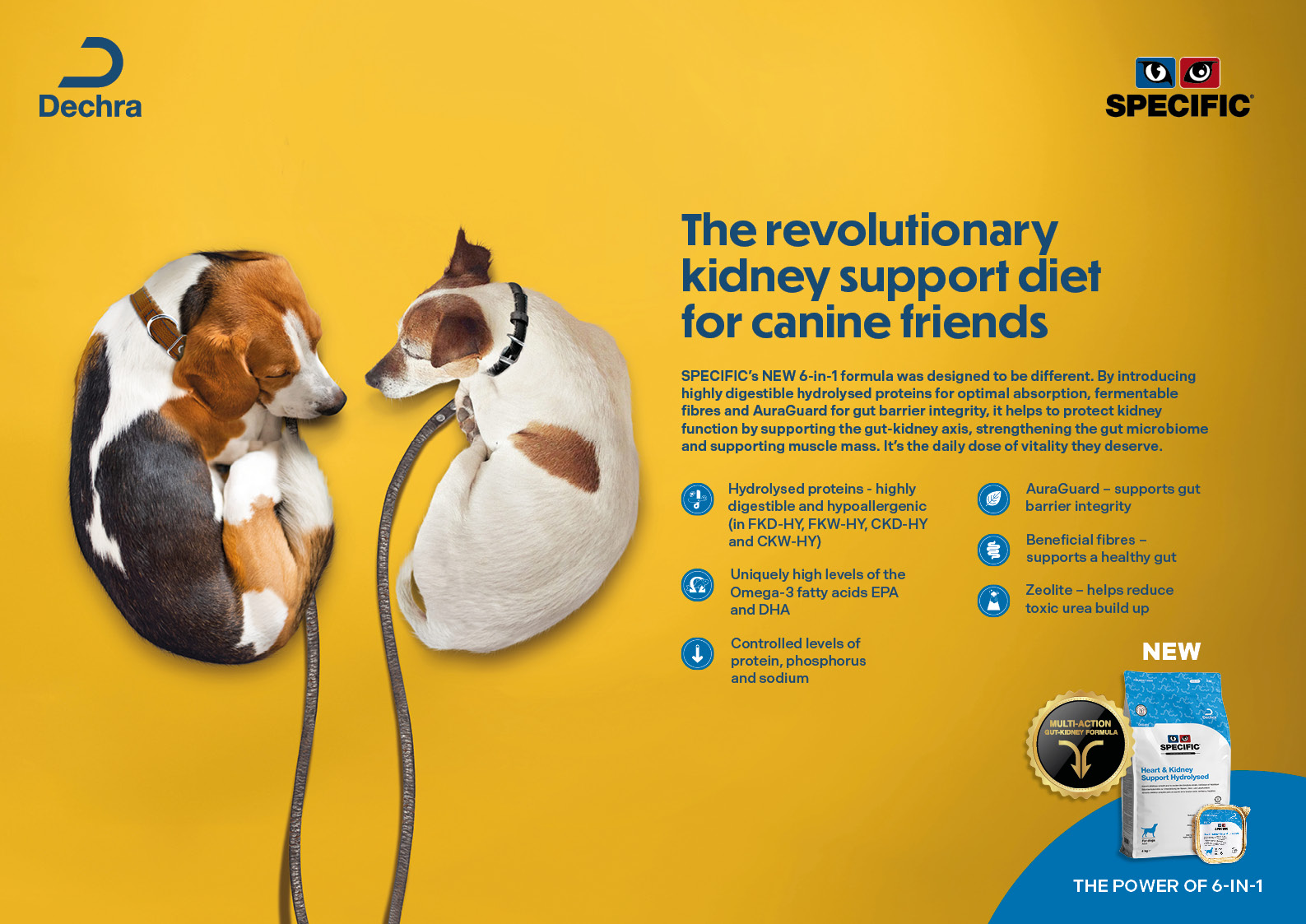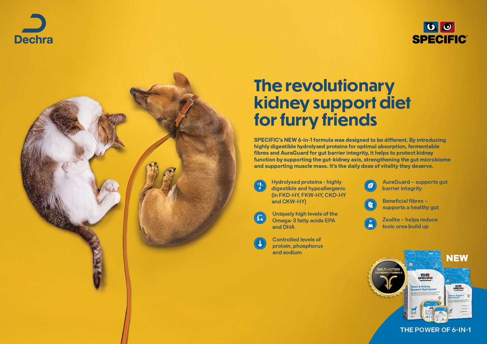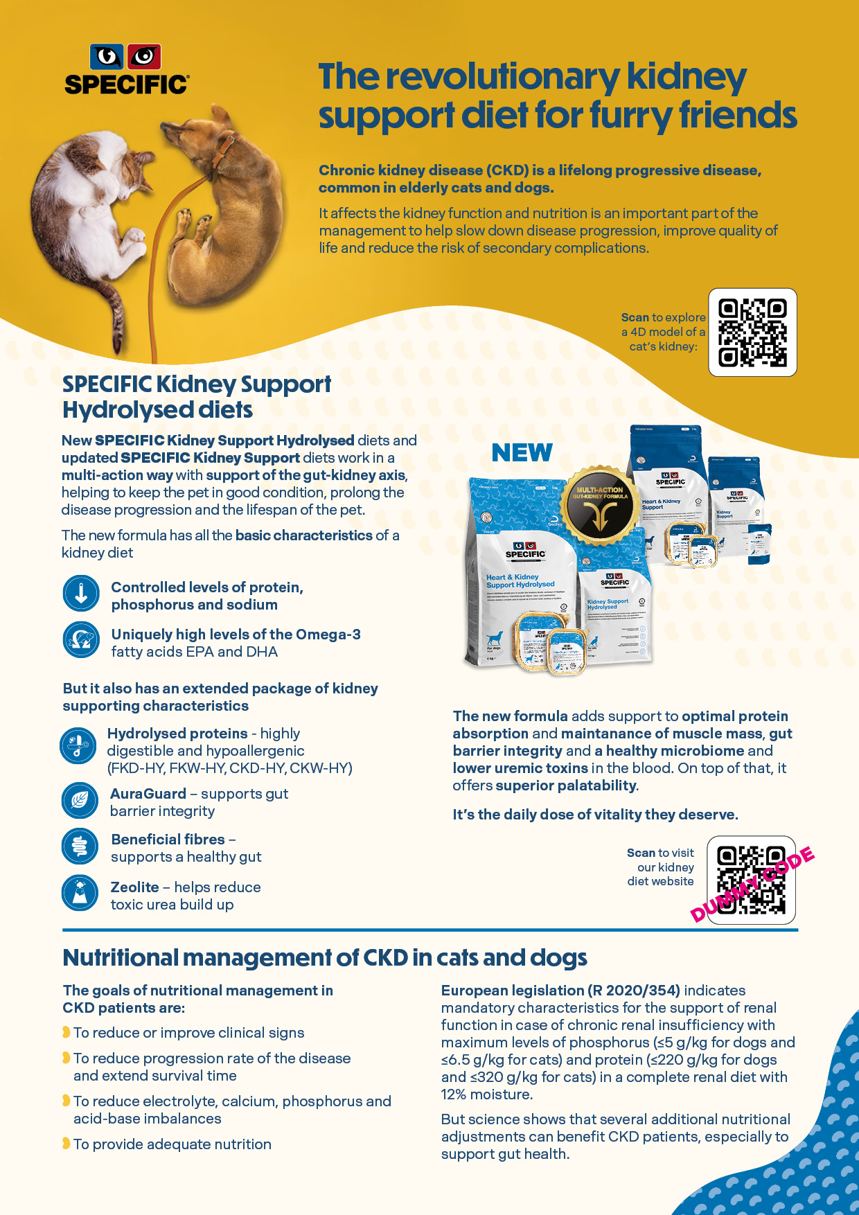 As novas dietas SPECIFIC Kidney Support Hydrolysed e as dietas SPECIFIC Kidney Support e Heart & Kidney Support actualizadas funcionam de forma muiti-action com apoio do eixo entero-renal, contribuindo para manter o paciente em boas condições clínicas.